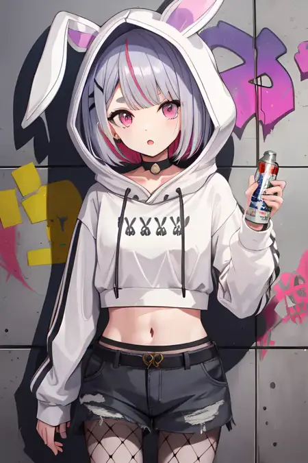 パンクの服装(フード付き):tosaki mimi, mimi punk, short hair, hoodie, hood up, rabbit hood, long sleeves, shorts, midriff, x hair ornament, black choker, fishnet pantyhose