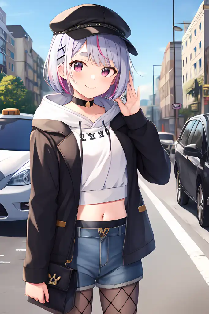 パンクの服装:tosaki mimi, mimi punk, short hair, cabbie hat, hoodie, hood down, long sleeves, black jacket, open jacket, shorts, midriff, x hair ornament, black choker, fishnet pantyhose
