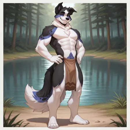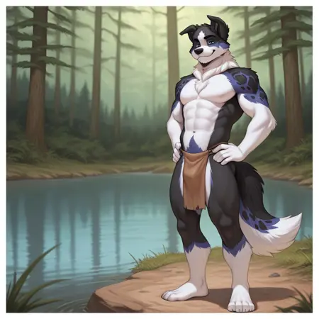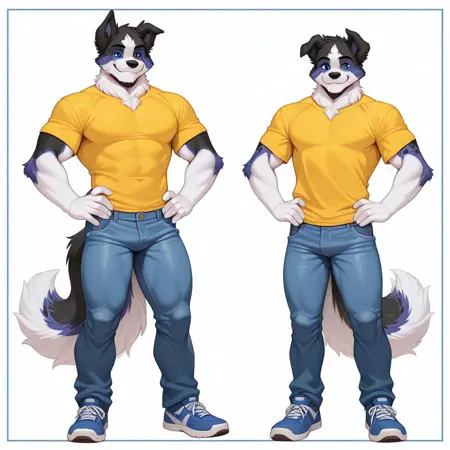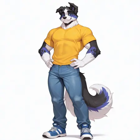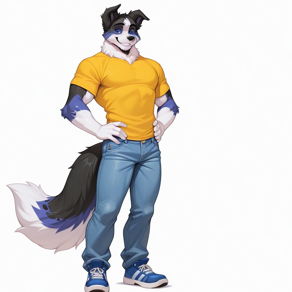 anthro, dog boy, border collie, black fur, blue fur, white fur, multicolored fur, blue eyes, dog ears, dog tail, fluffy tail,