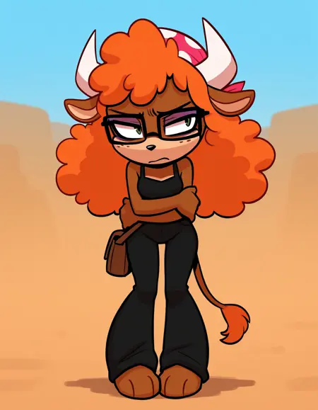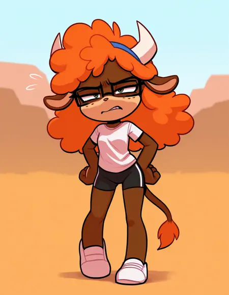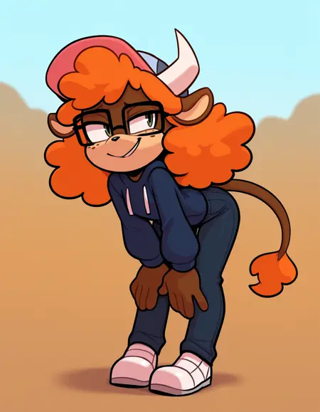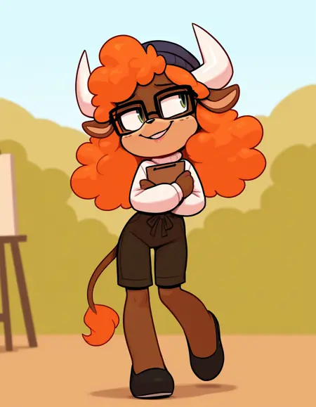 额外标签: 绿色眼睛,雀斑,白色角,棕色毛发,橙色头发,卷发,尾巴,眼镜,黑色镜框