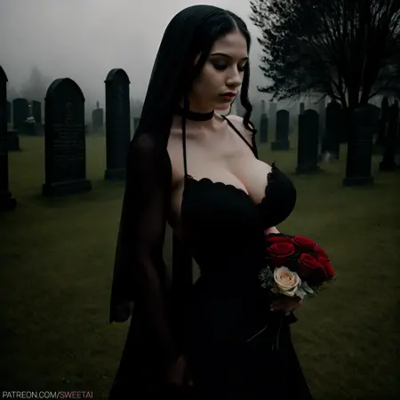 claire, cinematic film, dof, bokeh, lifelike, 巨大な胸元を持つ美しいアダムスが、黒いウェディングドレスを着て、黒い枯れバラの花束を手に、霧のかかった墓地の前で、黒いヴェールと黒いバラ、編み込み髪をまとっている