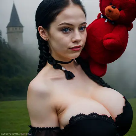 claire, raw photo, dof, bokeh, lifelike, 巨大な胸元と鋭い青い瞳を持つ美しいアダムスが、霧の古城で赤いぬいぐるみを抱えている