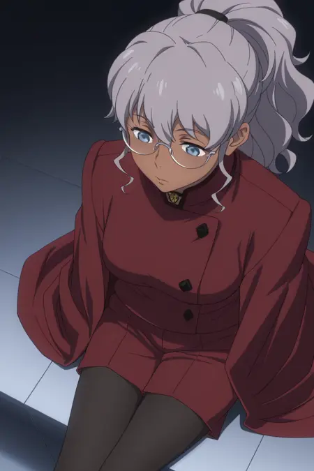 naomi, solo, 1girl, dark-skinned female, glasses, dark skin, ponytail, grey hair, grey eyes anime coloring, black pantyhose, redcoat uniform