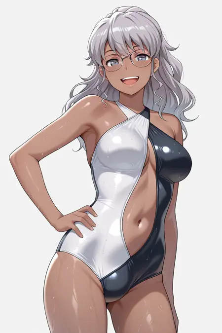 naomi, 1girl, dark skin, solo, one-piece swimsuit, dark-skinned female, swimsuit, glasses, long hair, navel, grey eyes, smile, open mouth, hand on hip, looking at viewer, blackwhite swimsuit