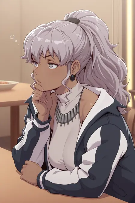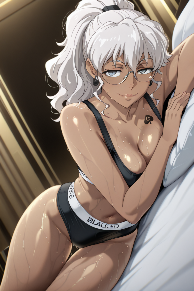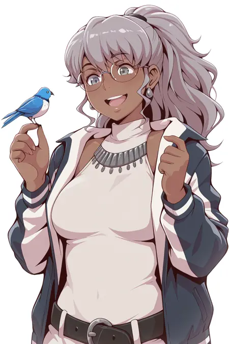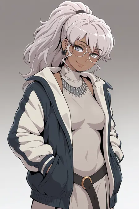 naomi, 1girl, solo, dark-skinned female, dark skin, jewelry, glasses, jacket, ponytail, earrings, necklace, smile, grey eyes, standart outfit