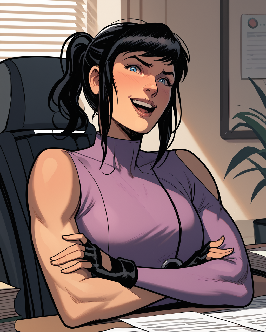 トリガー:katebishop, 黒髪, 青い目, ボディスーツ, 衣装のカットアウト, グローブ, 横髪, ポニーテール, ベルト, 指なしグローブ, ブーツ