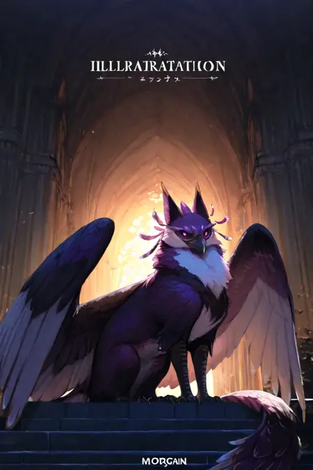 1个女孩,摩根,兽人,鸟女,毛茸茸的鸟类,狮鹫,狮鹫爪,狮鹫尾巴,鸟尾,喙,紫色眼睛,翅膀,羽翼,黑色翅膀,利爪,动物耳朵,羽毛,喙,鸟腿,紫色毛发,白色身体,紫色头发,双色毛发和身体,粗壮的肢体,大乳房,肚脐,