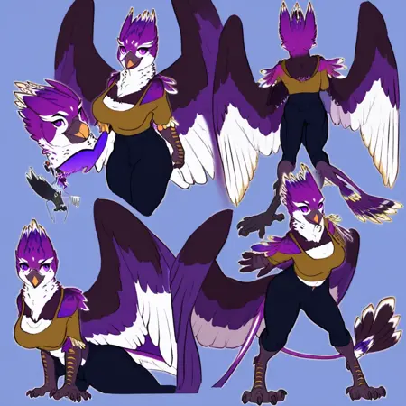 1girl,Morgan,Anthro,bird girl,furry avian,griffin,griffin paws,griffin tail,bird tail, beak,Purple Eyes,wings,feathered wings,Black wings,talon,animal ears,feathers,beak,bird legs,Purple fur,white body,purple hair,two-toned fur and body,thick thinghs,large Breast,navel,