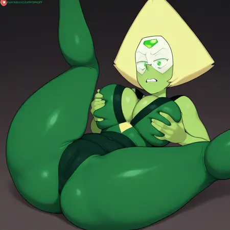 Tags: Peridot, green skin, yellow visor, green eyes, green forehead gem, diamond-shaped hair, yellow hair, pointy nose, dark green and black bodysuit, v-neck body suit,