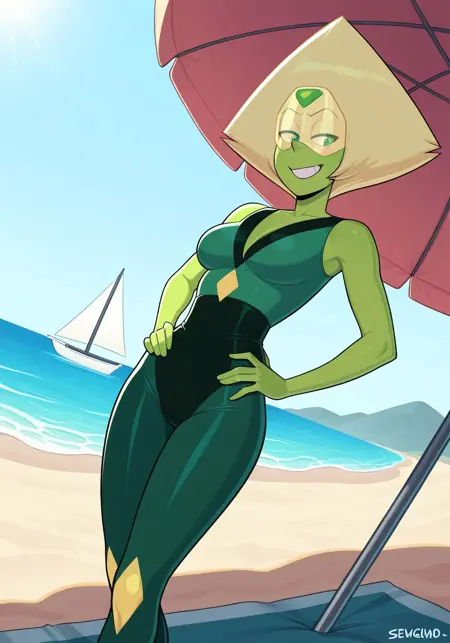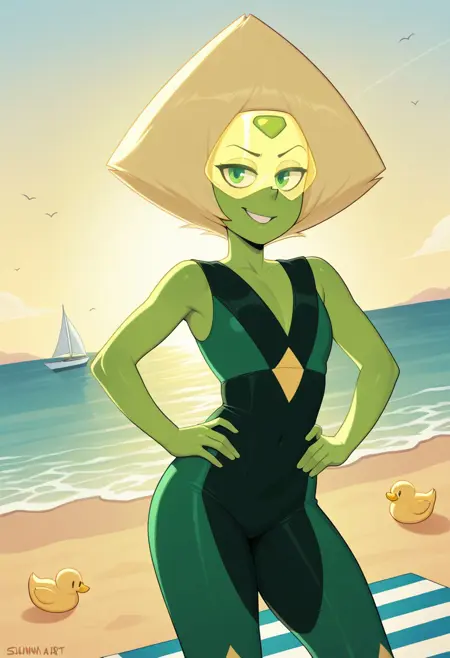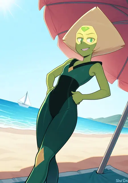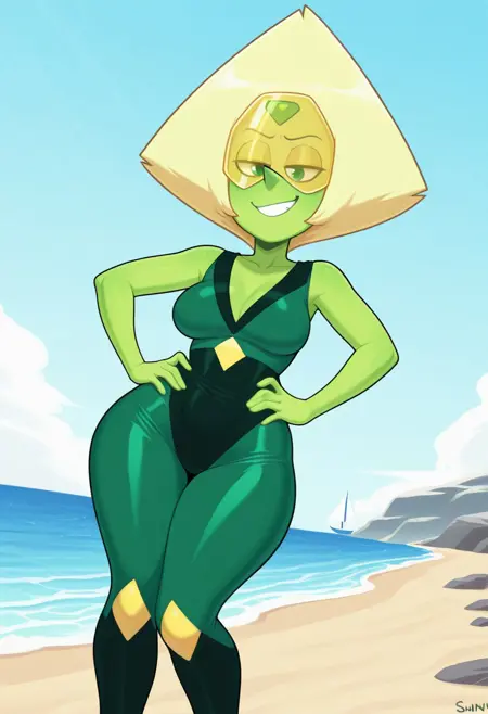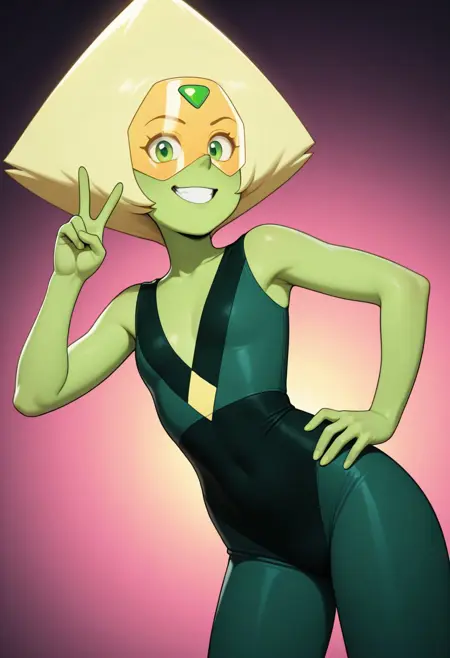 タグ:ペリドット、緑色の肌、黄色いビジョン、緑色の目、額の緑色のダイヤモンド、ダイヤモンド形の髪、黄色い髪、とがった鼻、濃い緑と黒のボディスーツ、Vネックボディスーツ