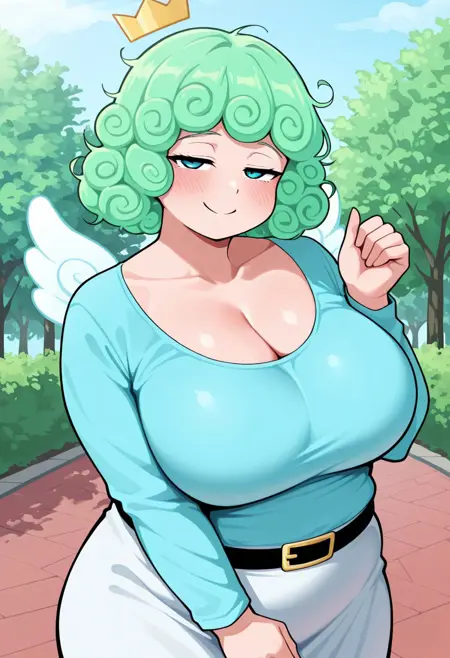カールヘア、ビーハイブヘア、緑の髪、青い目、翼