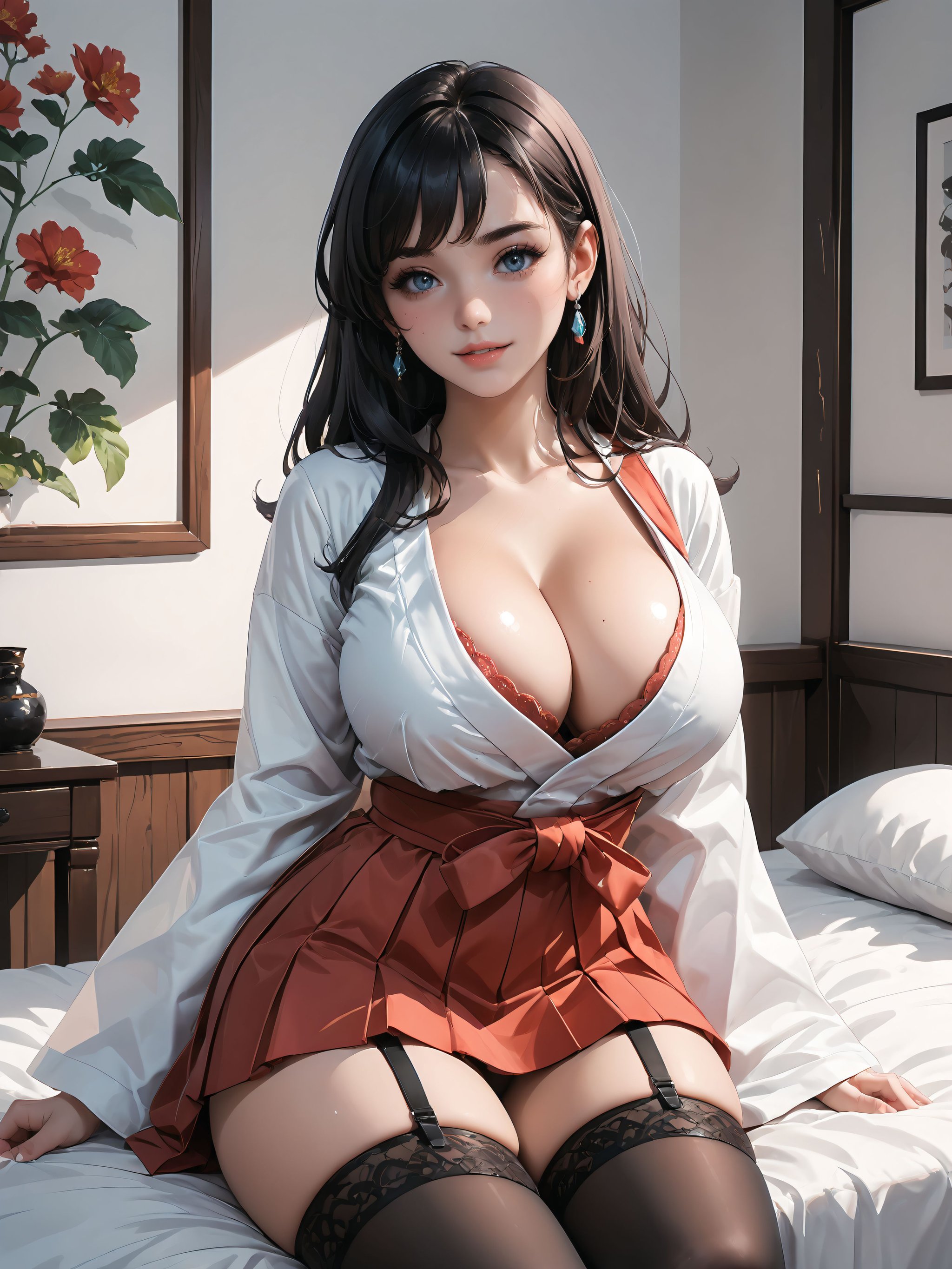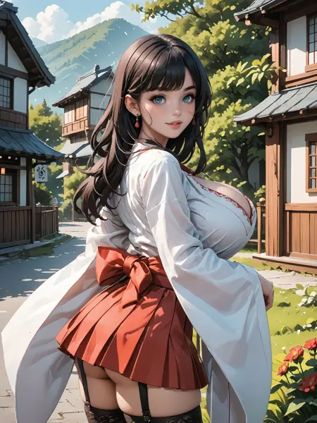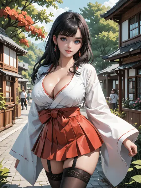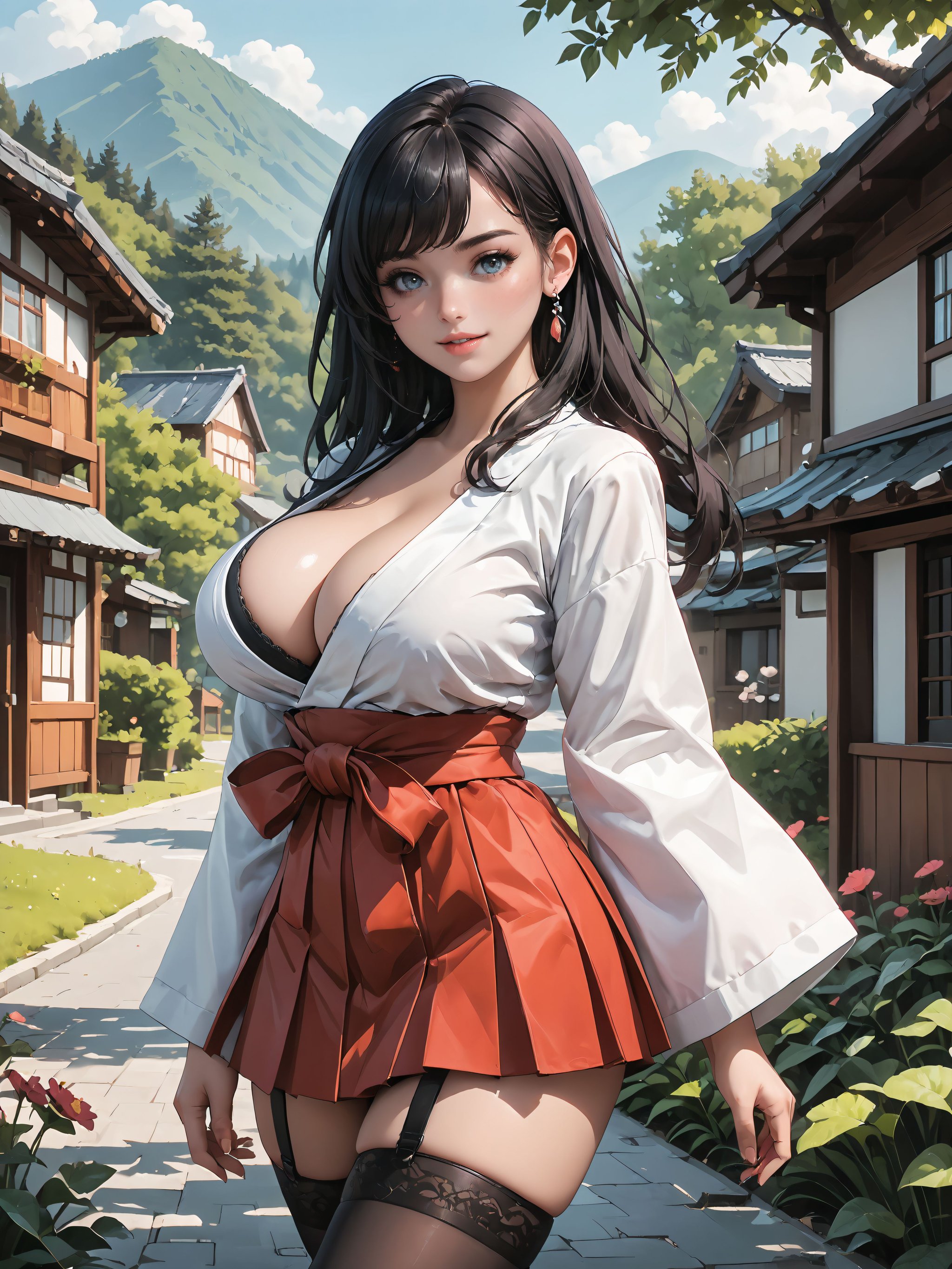 PONY ポジティブプロンプト: score_9, score_8_up, score_7_up, LORA, enomototsubasa, 胸元の露出、赤いスカート、日本の衣装、着物、長い髪、前髪、黒いストッキング、ガーターベルト、1人女孩、日本の村の背景、詳細な背景、屋外、笑顔、 happiness、砂時計型の体型、上半身、大きく開いた胸元、大きな胸、...