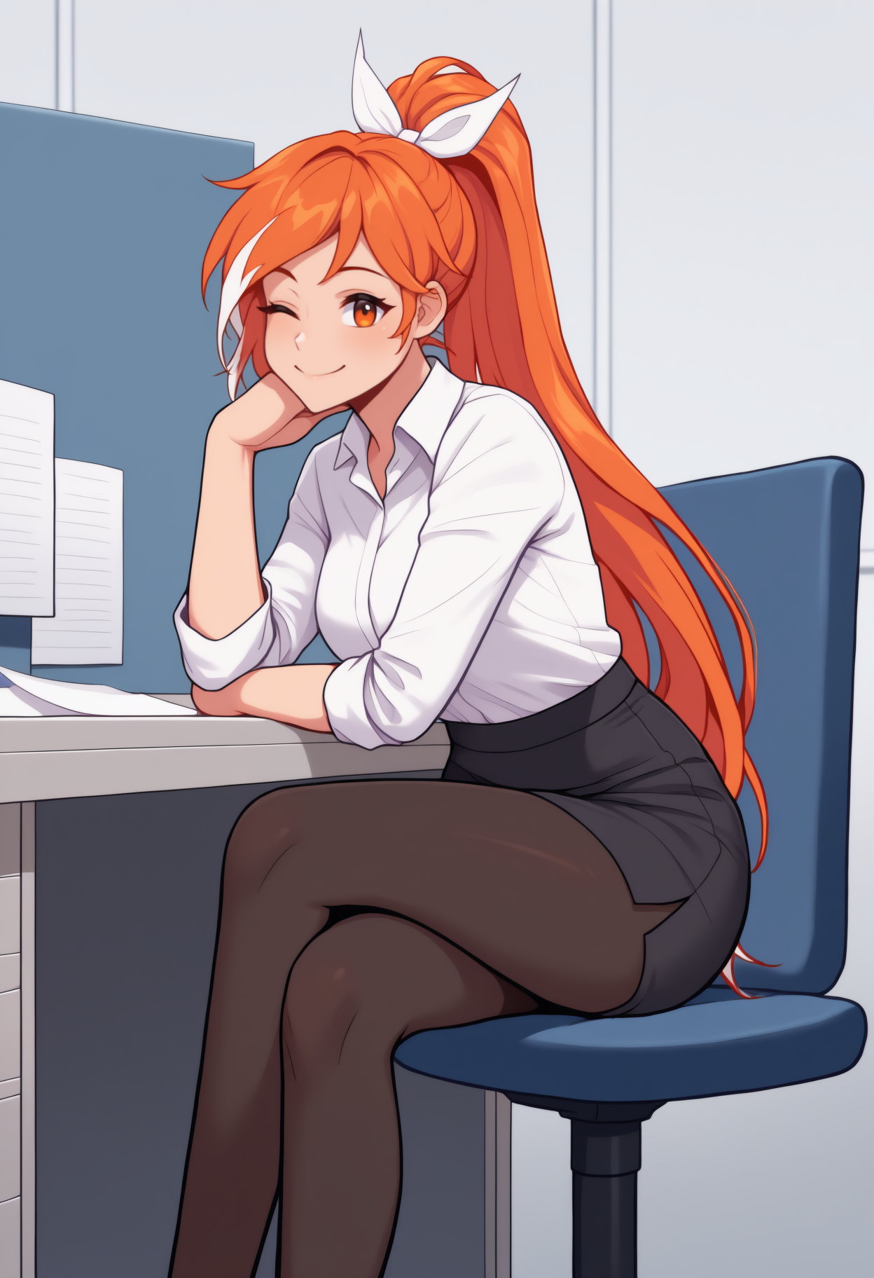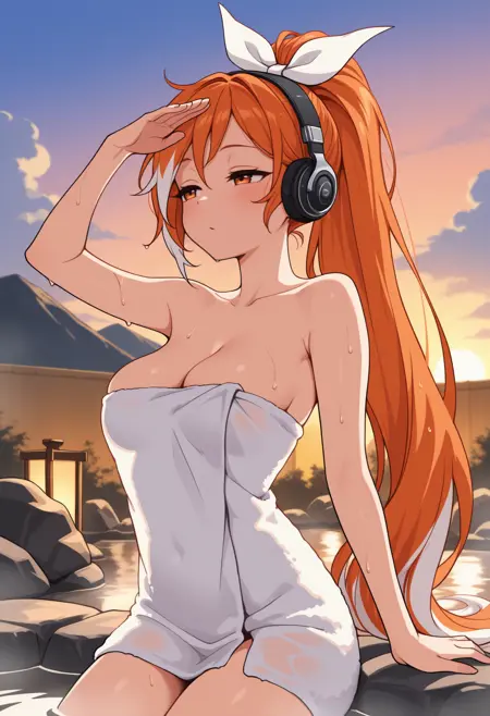触发词 + 外貌: h1me, 条纹发色, 橙色头发, 白色头发, 高马尾, 发带, 白色发带, 橙色眼睛