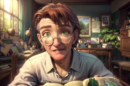 1个男孩,老人,独身,男性焦点,瘦弱,皱纹,绿眼睛,飞机头,剃边,波浪发,圆框眼镜,眼镜,有领衬衫,瘦腿,裤子,鞋子,正装鞋,丑陋,歪牙(添加:长发 在负面提示中)