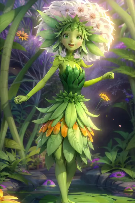 1个女孩,年龄增长,长裙,绿裙,花卉发型,绿眼睛,绿发,彩色皮肤,绿色皮肤,蒲公英帽,植物女孩,拟人化