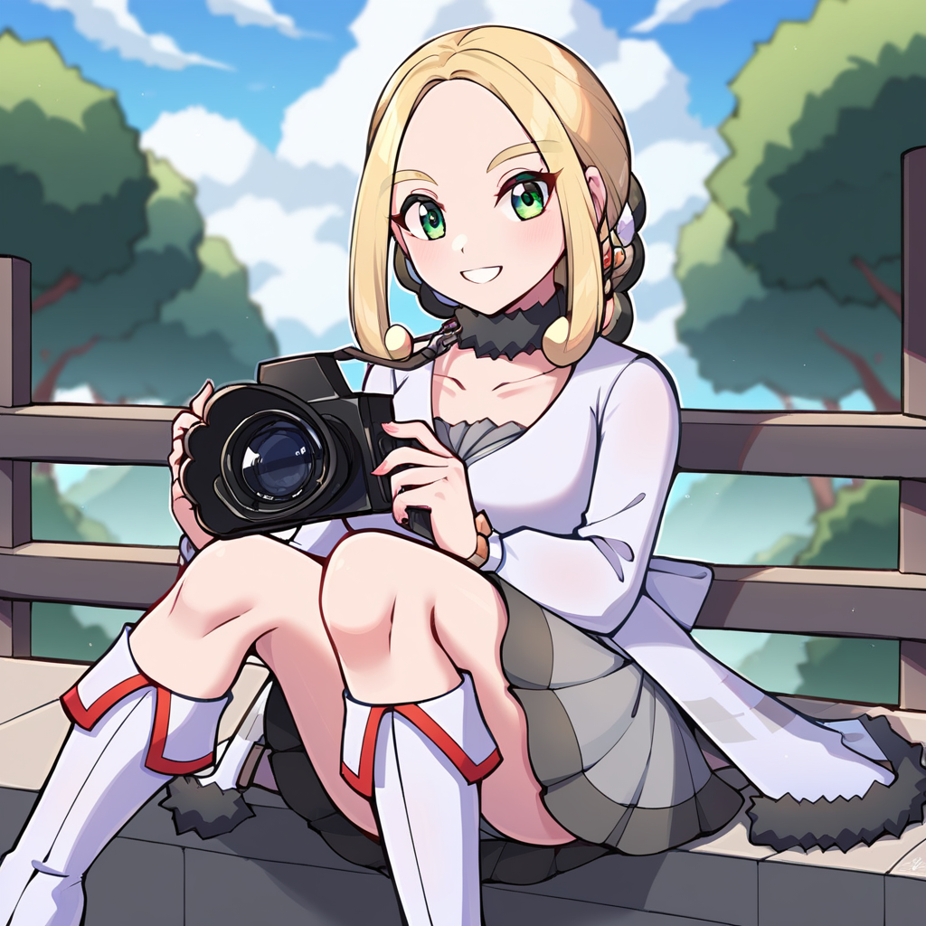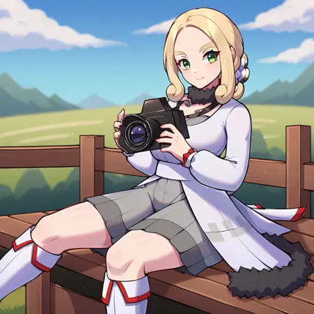 hoviola, def colors, green eyes, blonde hair, sidelocks, hair ornament, white coat, long sleeves, dark grey fur collar, dark grey fur trim, white sash, grey dress, knees, knee boots, white footwear, camera, holding camera