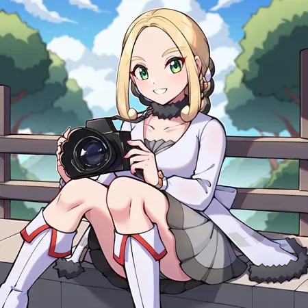 hoviola, def colors, green eyes, blonde hair, sidelocks, hair ornament, white coat, long sleeves, dark grey fur collar, dark grey fur trim, white sash, grey dress, knees, knee boots, white footwear, camera, holding camera