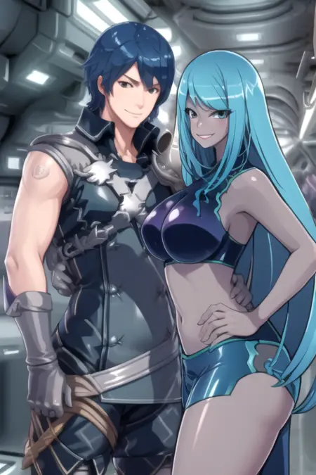 ChromDSamus, a man and a blue woman, hetero, standing, smile, cowboy shot