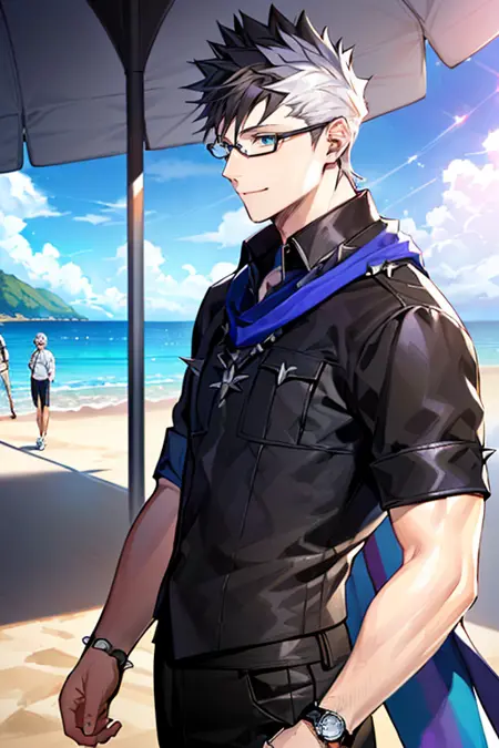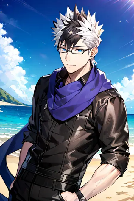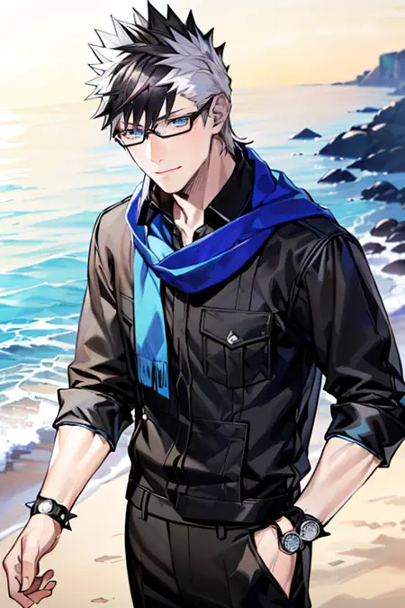 시그르드Summer, 안경, 검은 셔츠, 검은 바지, 파란 스카프