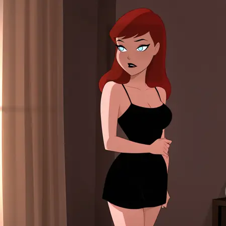带睡袍的触发词:BarbaraAdventuresLingerie, 1girl, 红发, 睡袍, 黑色嘴唇, 妆容, 口红, 长发, 连衣裙, 牛仔构图