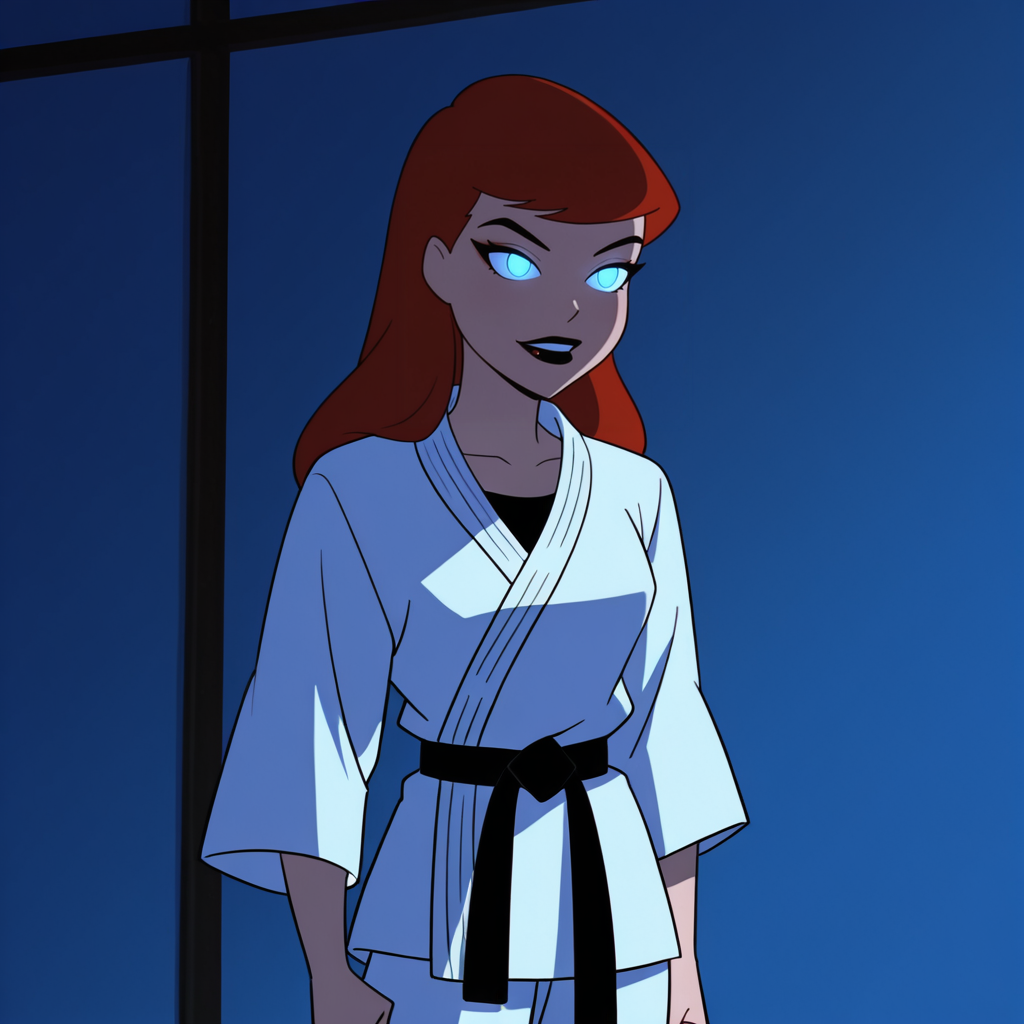 带空手道服的触发词:BarbaraAdventuresMisc, 1girl, 红发, 蓝眼睛, 道服, 黑色腰带, 发光眼睛, 妆容, 黑色嘴唇, 口红, 长发, 武术腰带, 黑色腰带, 牛仔构图