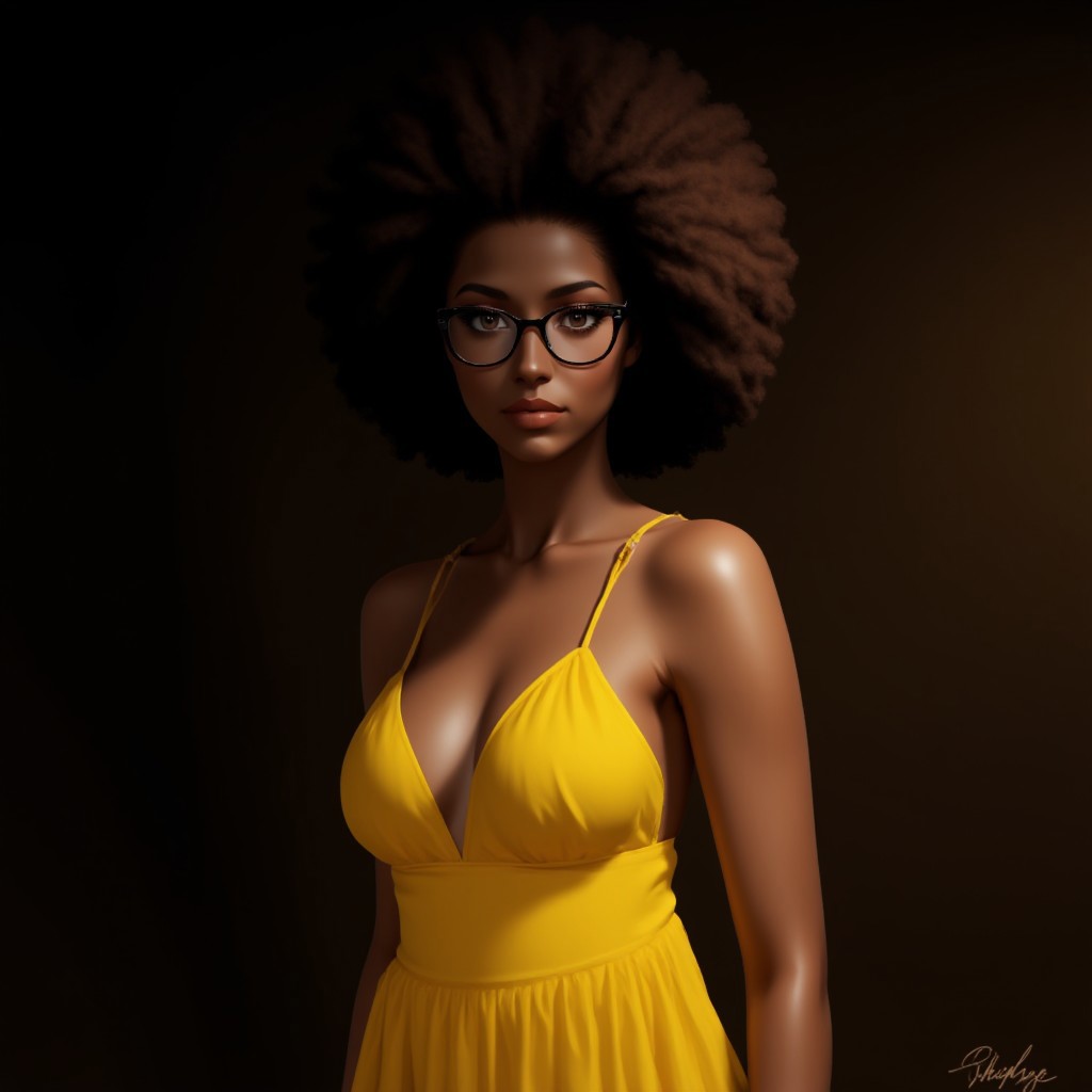 1girl,brown hair,brown eyes,dark skin,makeup,glasses,afro,yellow dress