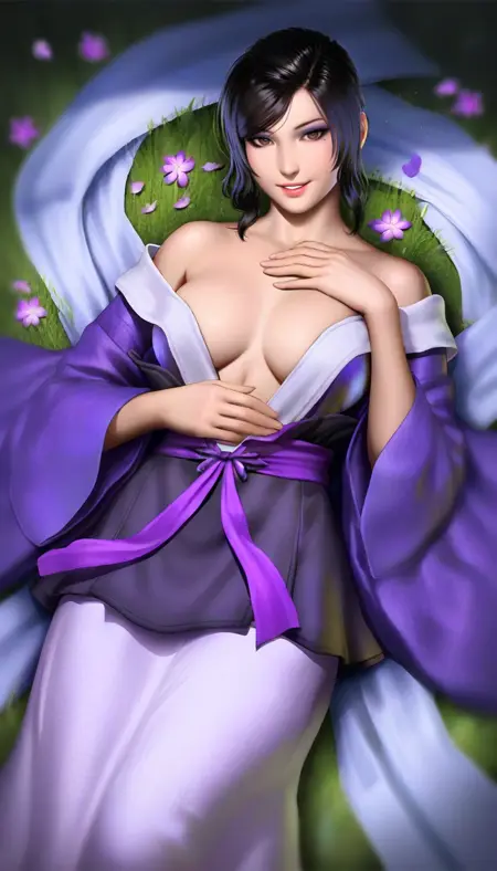 zhenji, realistic, 1girl, solo, black hair, bangs, updo, brown eyes, purple eyeshadow, gold neckwear with red gem, purple robe top, light purple tube top underneath, deep purple waistwrap, purple waist ribbon, light purple sash around arm, light purple long silk skirt, black flat shoes,