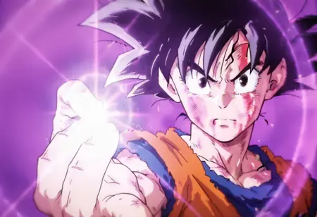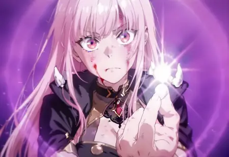 gojofacing2, 1girl/1boy, 脸上有瘀伤, 脸上有血迹, 皱眉, 上半身, 手举起, 看着观众, 嘴闭着, 紫色背景, 魔法, 能量球, 即将攻击, 衍射光斑, 动画截图,