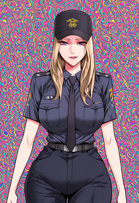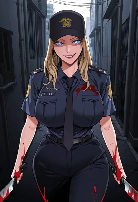 (女性の韓国刑務所警備員制服、短袖のネイビー色の刑務所警備員シャツ(警備員バッジ付き)、濃い青いネクタイ、黒いベルト付き濃い青いズボン、バッジ付き濃い青い刑務所警備員野球帽、)