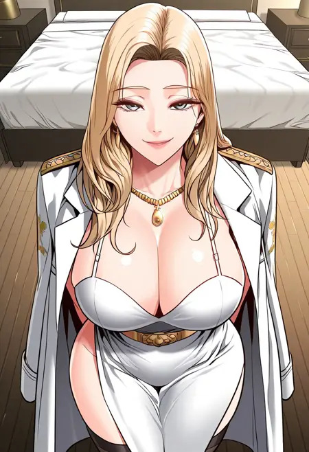 (肩に高級なふわふわの白いコート、高級なノースリーブの切り取り白いドレス、高級なゴールドベルト、巨大なゴールドペンダント付きの高級なゴールドネックレス、高級なゴールドイヤリング、高級なゴールドブレスレット、巨大な胸元、露骨な胸元、透け感のある黒いタートルストッキング、白いハイヒール)高級な茶色のバッグ、