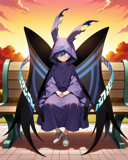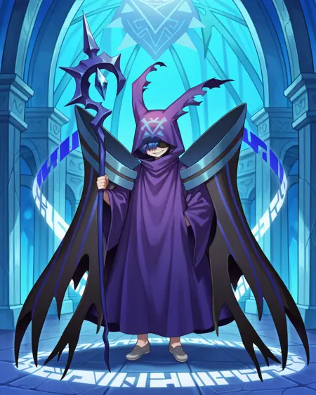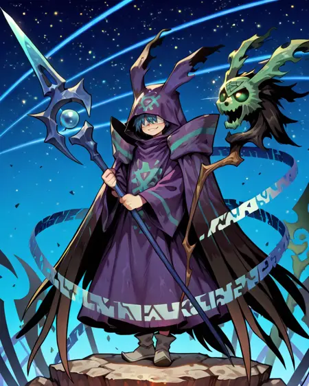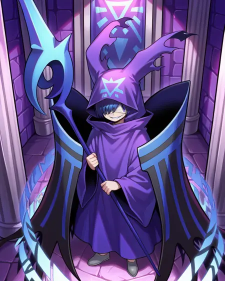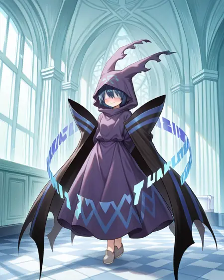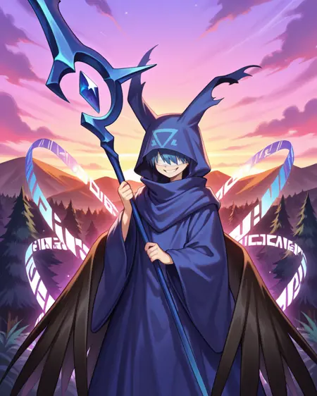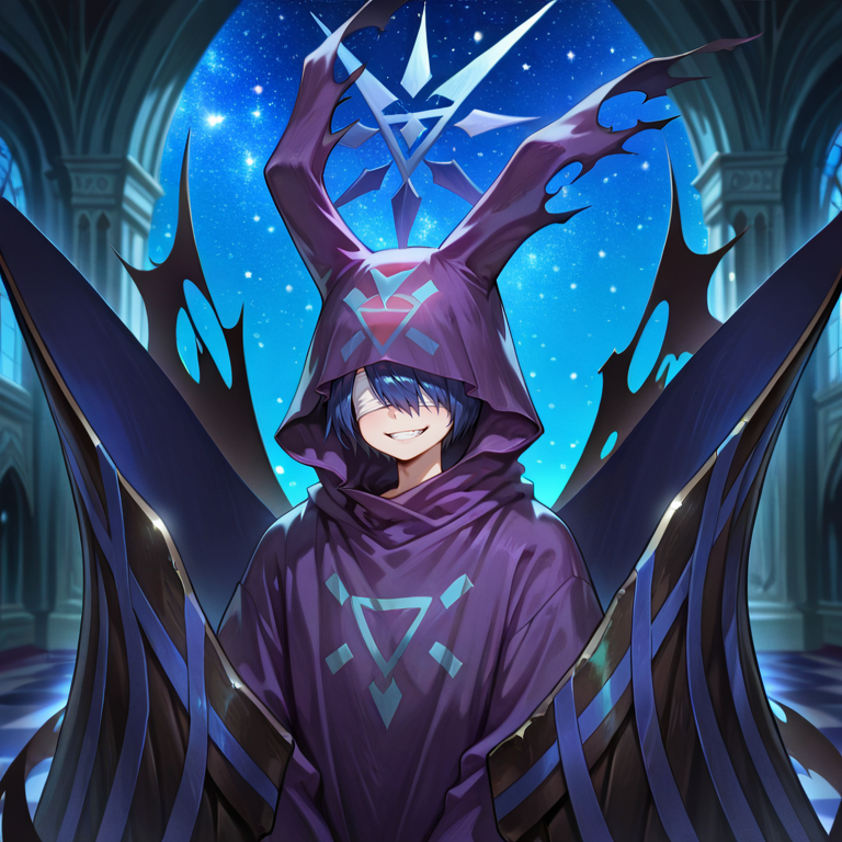 유용한 태그: 1boy, 파란 머리카락, 머리카락으로 눈 가린, 눈가림, 후드 올린, 동물 귀 후드, 문양, 로브, 검은 날개, 파란 줄무늬, 회색 신발, 루네