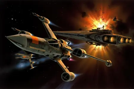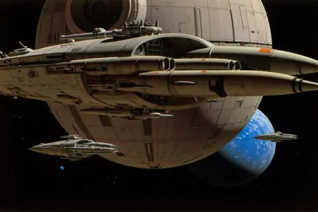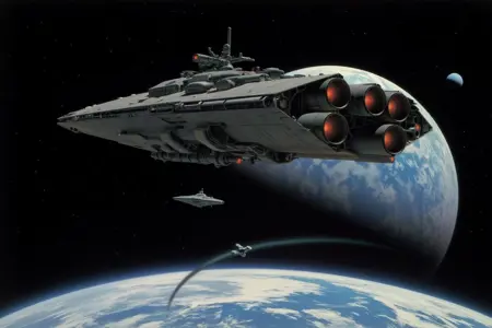 若い映画監督のGeorge Lucasは、McQuarrieの作品に感銘を受け、彼と会い、宇宙ファンタジー映画『The Star Wars』の計画について話し合いました。Lucasは映画会社にプレゼンを成功させるための視覚的参考資料を求め、John BerkeyのSFアート作品を購入しました。[4] 1975年、LucasはMcQuarrieに映画のスクリプトからいくつかのシーンを描くよう依頼しました。McQuarrieはBerkeyのいくつかの作品、特に巨大な機械的な惑星に向かって宇宙を急降下するロケット・プレーンの絵画(この画像は1972年に再版された短編集『Star Science Fiction Stories No.4』の表紙に使用されました)にインスピレーションを受けた可能性があります。[5]