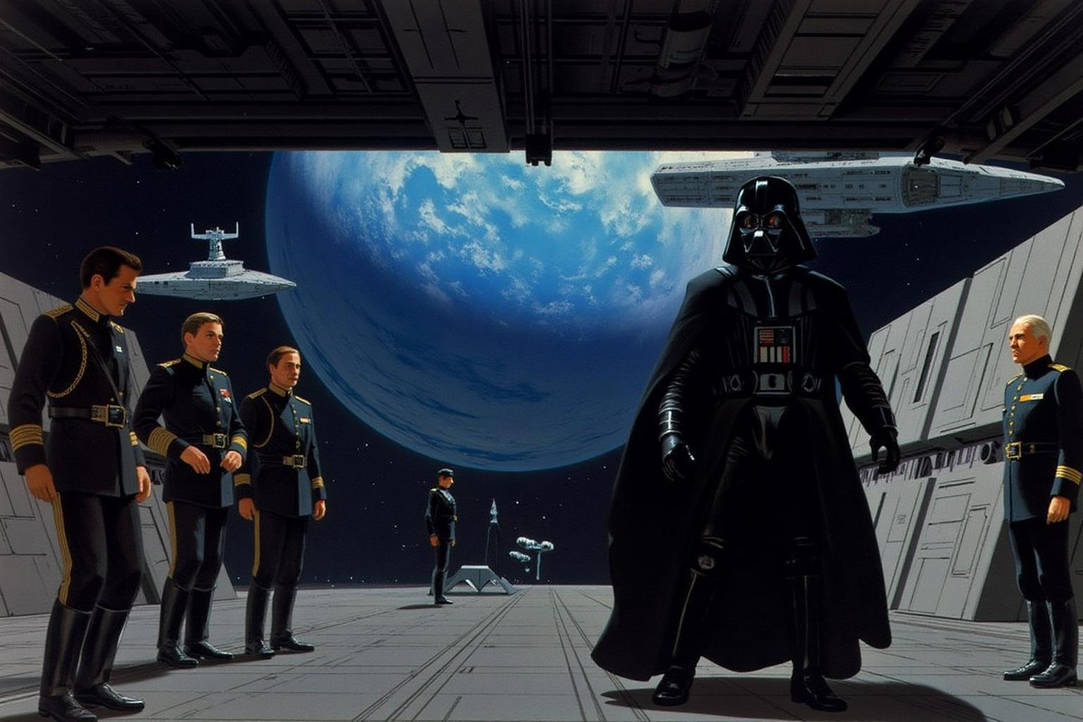 Lucasの提案により、McQuarrieはDarth Vaderが着用する呼吸装置をデザインしました。[13] 『スター・ウォーズ・インサイダー』誌へのインタビューで、McQuarrieはLucasの芸術的指示について次のように述べています。「スパイクのような衣装をまとった悪意に満ちた人物で、侍の鎧のようなイメージを描いてほしい」と。彼は「Darth Vaderについては、ジョージ[Lucas]は、風に乗って現れるような、非常に背が高く、暗く、ゆらめく、不気味な存在を希望しました」と語っています。McQuarrieは、脚本でVaderが宇宙船間を移動し、宇宙の真空で生存できる必要があると指摘し、Vaderが某种の宇宙服を着用すべきだと提案しました。Lucasはこれを承認し、McQuarrieはフルフェイスの呼吸マスクと侍の兜を組み合わせ、宇宙ファンタジー映画で最も象徴的なデザインの一つを生み出しました。[12][14] 1975年の制作用絵画では、Darth VaderがライトセーバーでDeak Starkiller(Luke Skywalkerの原型キャラクター)と戦っています。この絵画ではVaderが黒い鎧、流れるようなマント、細長い頭蓋骨のようなマスクとヘルメットを着用しています。このデザインが最終的なVaderの衣装に非常に近いことから、McQuarrieの初期のVader構想が非常に成功していたことがわかり、製作段階でほとんど変更が加えられませんでした。[10] McQuarrieのアートワークをもとに、衣装デザイナーのJohn Molloは、牧師のローブ、オートバイスーツ、ドイツ軍のヘルメット、ガスマスクを組み合わせた衣装を考案しました。[15] プロップ彫刻家のBrian Muirは、McQuarrieのデザインに基づいて映画で使用されたヘルメットと鎧を作成しました。[16]