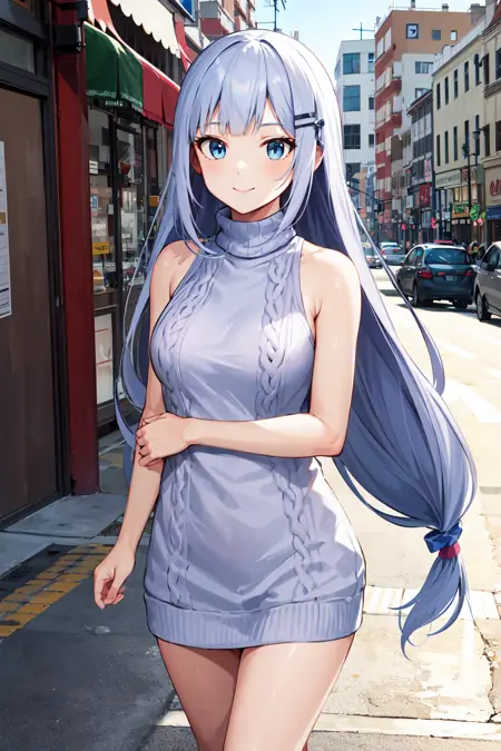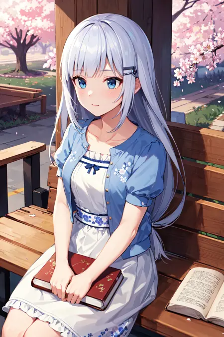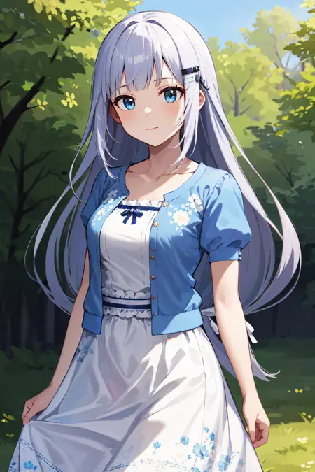 服装1aatsumugi, long hair, low-tied long hair, blunt bangs, hairclip, collarbone, short sleeves, blue jacket, white dress, puffy sleeves, open clothes, floral print
