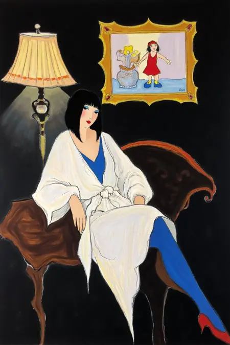 • 他的画作通常描绘在放松、私密环境中优雅的女性,场景常设于咖啡馆、休息室或精致的室内空间