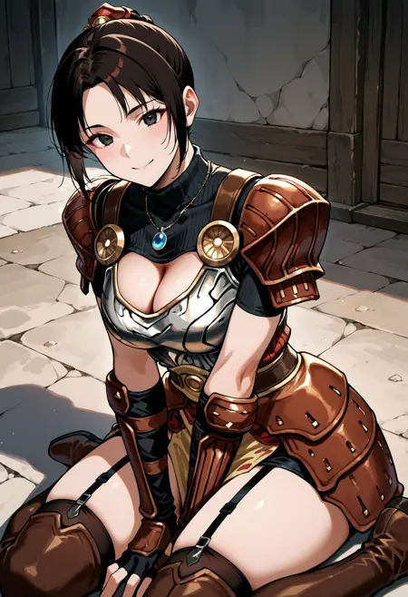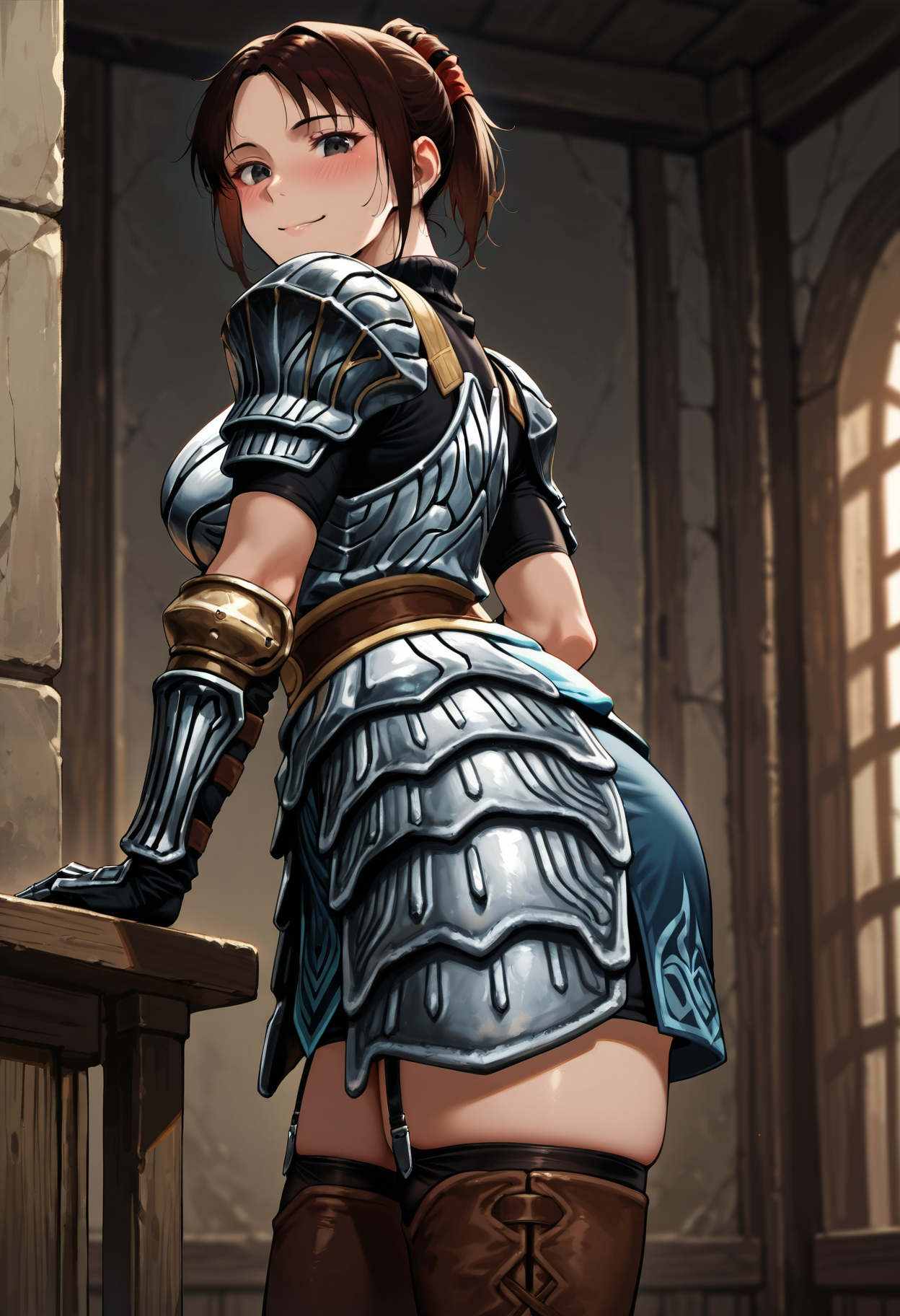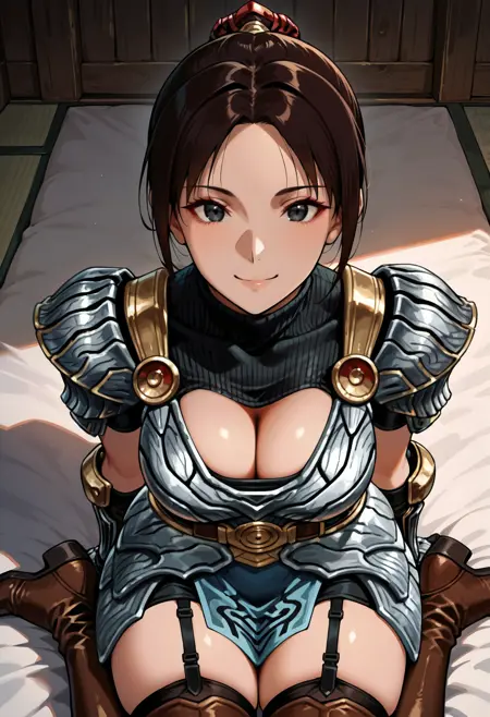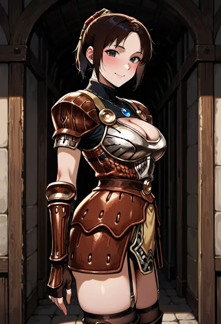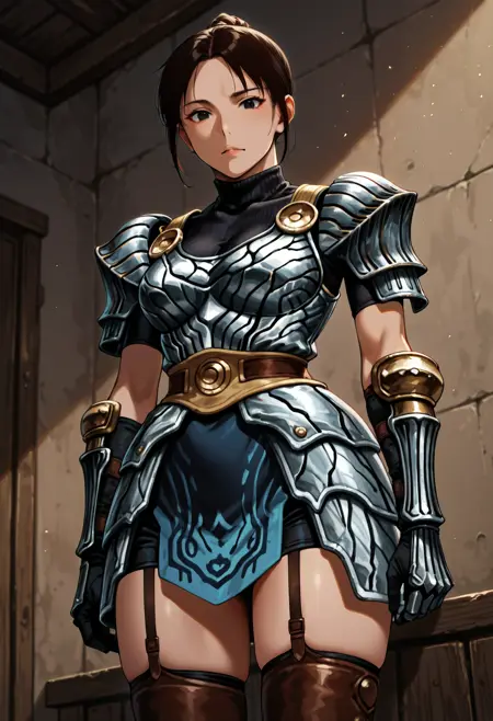 onioyu-plate, brown armor, cleavage cutout, silver breastplate, thighhighs, thigh boots, garter straps, gloves, fingerless golves, pauldrons,