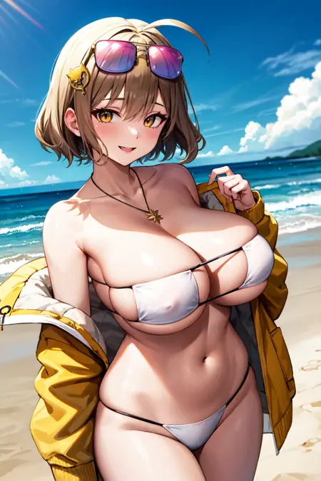 아우트핏2 (자켓 착용)hmanis, short hair, ahoge, hair ornament, eyewear on head, necklace, cleavage, eyepatch bikini, white bikini, yellow jacket, open jacket, off shoulder