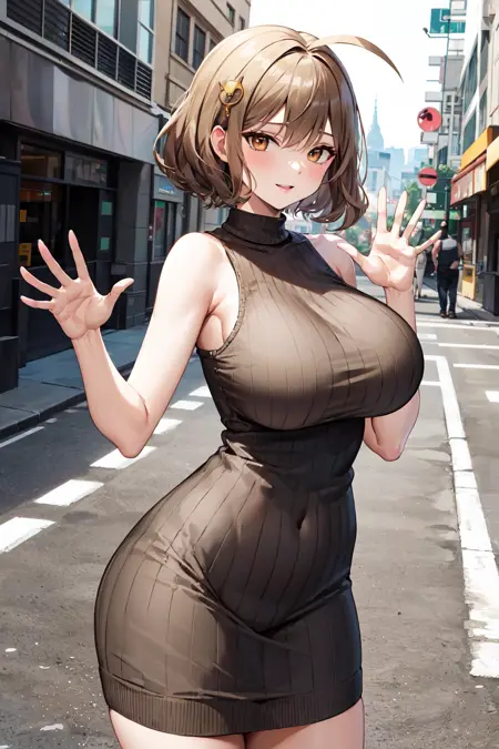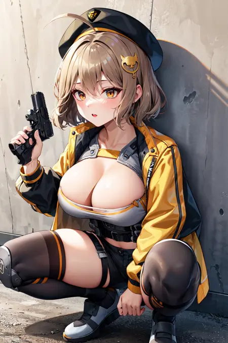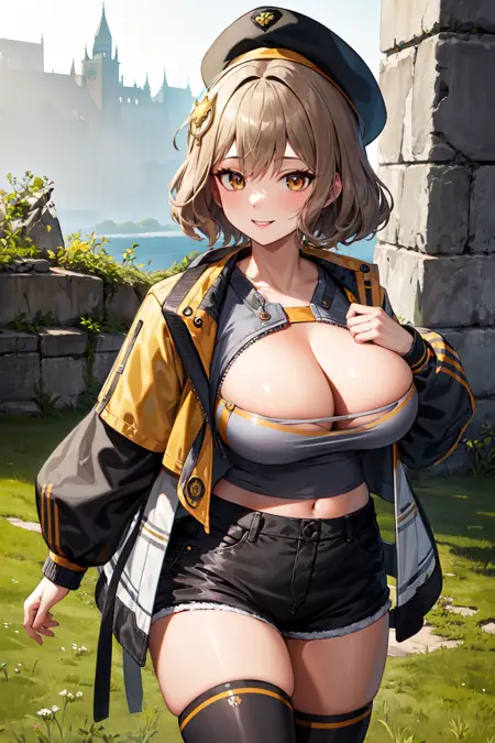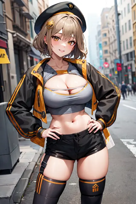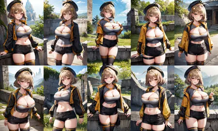 아우트핏1hmanis, short hair, ahoge, hat, beret, hair ornament, cleavage, grey shirt, crop top, black jacket, open jacket, long sleeves, black shorts, short shorts, black thighhighs, knee pads