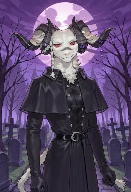 🖌️ Recommed : vlaham,white body,goat horns,horn ornament,goat boy,chest tuft,red eyes,colored sclera,side braid,looking at viewer,tail,goat tail,solo,1boy,furry,furry male,