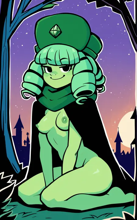 強化タグ: 緑色の肌、緑色の目、緑色の髪、カールした髪、ドリル髪、黒い目