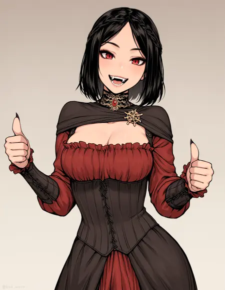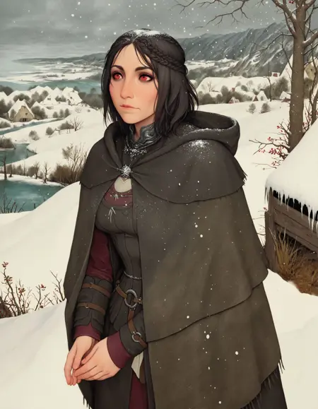 Serana, 黑发, 编发, 苍白肤色, 红眼, 黑色短斗篷, 帽兜下垂,
