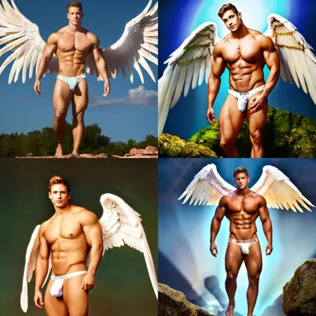 masterpiece, best quality, highres, realistic, wide shot, full shot, feet out of frame, full shot, full body, looking at viewer, a shirtless homoerotic man wearing a white skin-tight loincloth with large bulge and outspread angel wings, digital art, fantasy, solo, 1boy, wings, muscular, abs, realistic, large pectorals, navel, underwear, nipples, angel, male focus, topless male, angel wings, feathered wings, muscular male, brown hair, looking at viewer