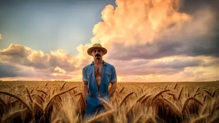 masterpiece, best quality, highres, realistic, a barechest homoerotic man standing in a field of wheat, 1boy, male focus, solo, straw hat, overalls, outdoors, naked overalls, realistic, sky, mustache, cloud, field, day, looking at viewer, cloudy sky, standing, grass, blue sky, brown hair, twink
