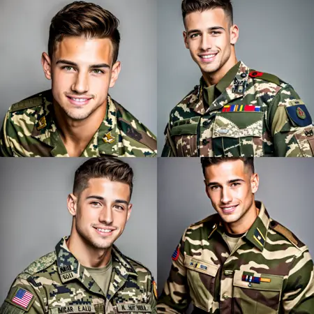 masterpiece, best quality, highres, realistic, 1boy, male focus, solo, realistic, camouflage, military, uniform, brown eyes, looking at viewer, facial hair, upper body, black hair, smile, shirt, grey background, stubble, simple background, brown hair, short hair