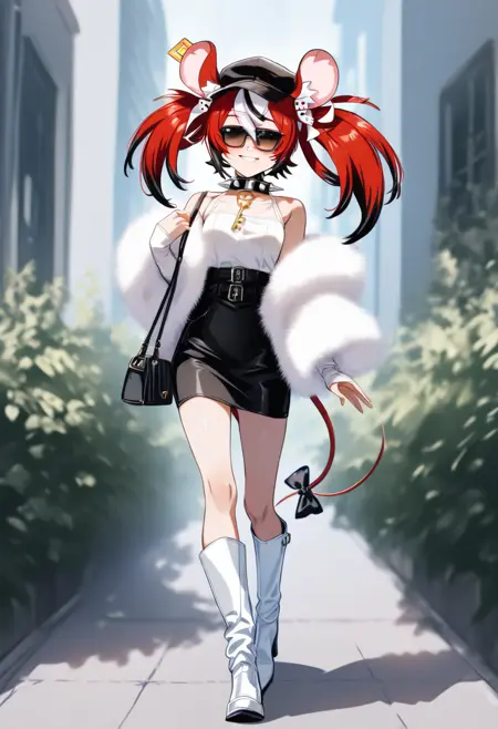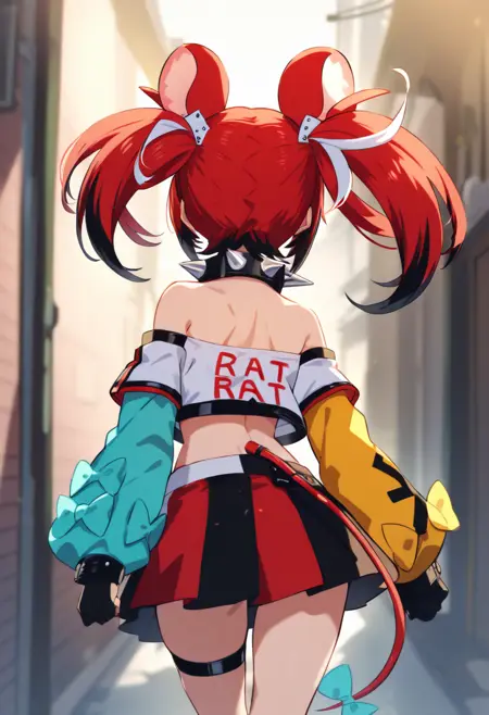 Hakos_Baelz, twintails, mouse tail, tail bow, spiked collar, key necklace, bare shoulders, white shirt, clothes writing, asymmetrical sleeves, red and blue sleeve, yellow sleeve, black gloves, midriff, multicolored skirt, thigh strap, mouse tail, tail bow