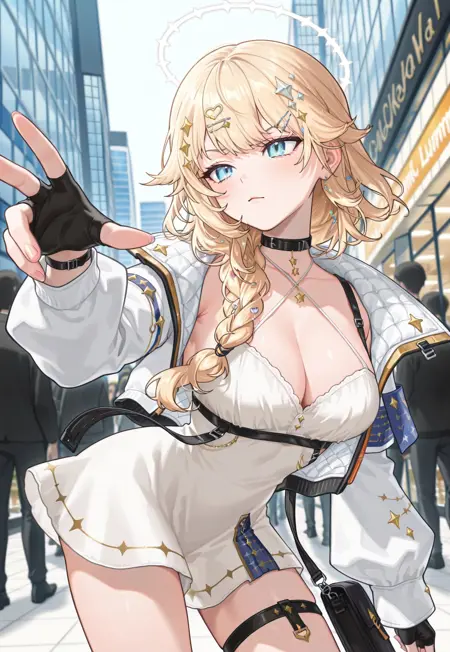Second Outfit: (Sundress Outfit) lumiTWO, 1girl, blue eyes, blonde hair, long hair, hair over shoulder, single braid, hairclip, heart hair ornament, diamond hair ornament, wing hair ornament, star (symbol), earrings, (white halo), black choker, belt collar,star necklace, criss-cross halter, medium breasts, cleavage, white dress, short dress, sleeveless dress, belted dress, thigh strap, white jacket, open jacket, long sleeves, asymmetrical sleeves, fingerless gloves, black gloves, jewelry,