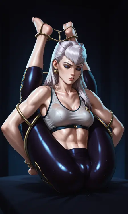 Prompting: metal bondage frame, legs up, legs behind head, cuffed wrists