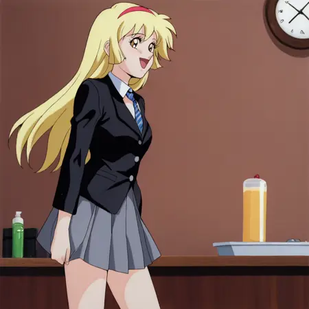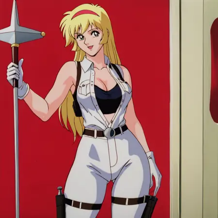 トリガー:Honey, 1girl, 金髪, レトロアートスタイル, 長髪, ヘアバンド, ジュエリー, スカート, ブレスレット, 1980年代(スタイル), 1990年代(スタイル), チョーカー, カウボーイショット