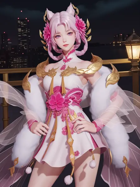 - WZRYchangeJSS, 1girl, solo, flower, pink hair, purple eyes, barefoot, dress, hair ornament, looking at viewer, hair flower, fur trim, tassel, hair rings, cityscape, night,