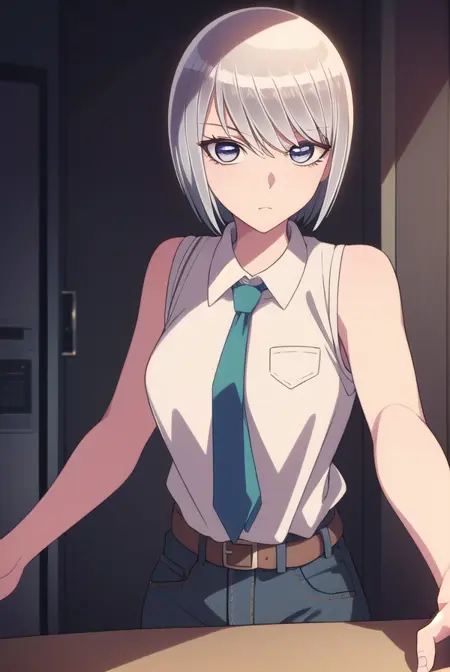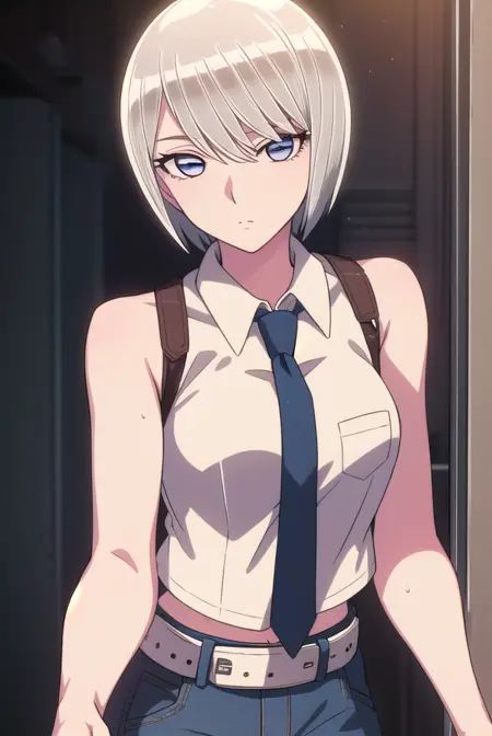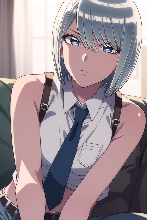bare shoulders, sleeveless, belt, pants, crop top, denim, jeans, necktie, collared shirt,